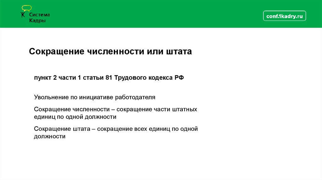 Сокращение численности или штатапункт 2 части 1 статьи 81 Трудового кодекса РФ