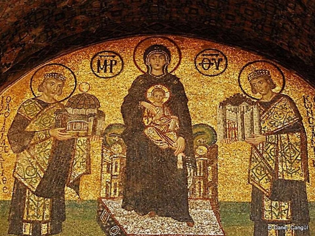 60. Мозаика Богородицы с предстоящими императором Иоанном II Комнином и императрицей Ириной, 12 в.