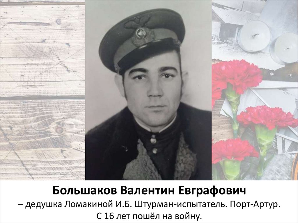 Большаков Валентин Евграфович– дедушка Ломакиной И.Б. Штурман-испытатель. Порт-Артур.