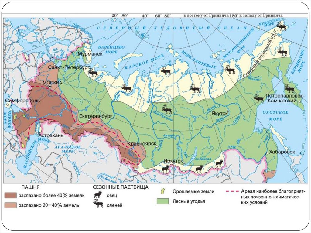 территории России доля сельскохозяйственных земель столь
