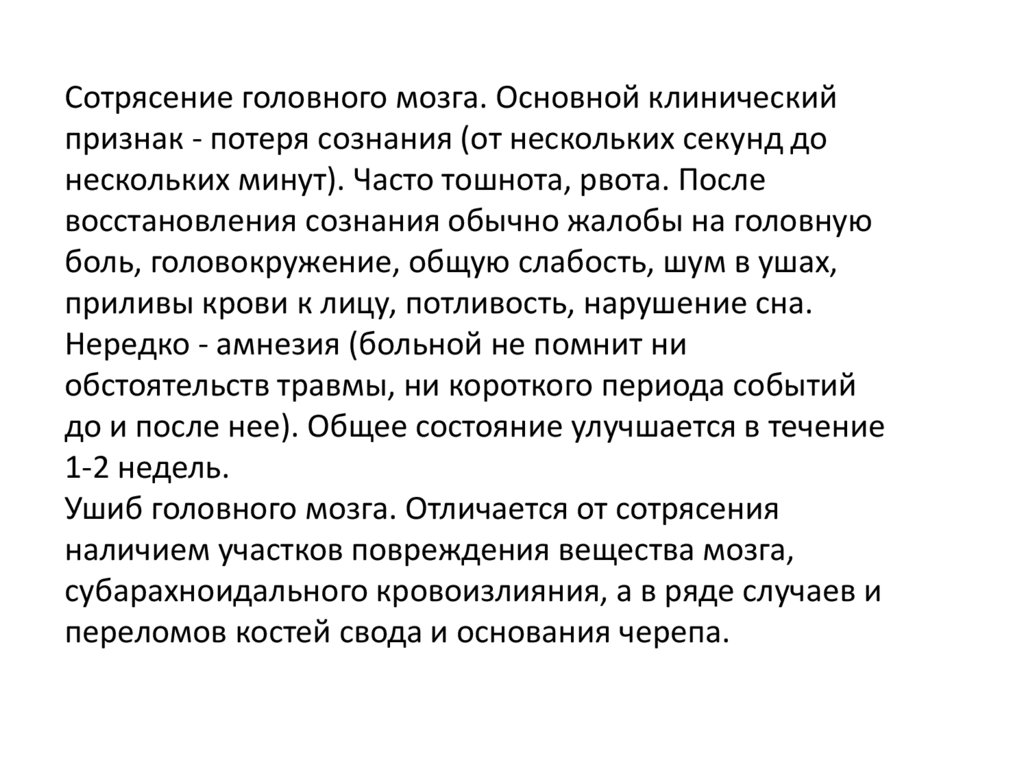 Сотрясение головного мозга. Основной клиническийпризнак - потеря сознания (от нескольких секунд до