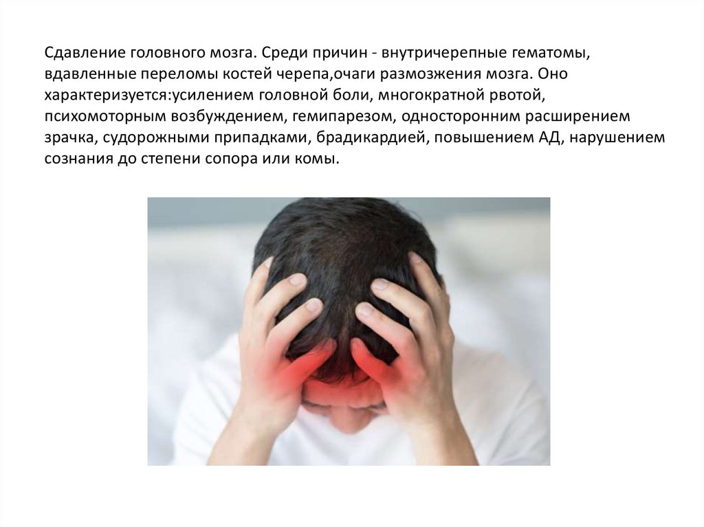 Сдавление головного мозга. Среди причин - внутричерепные гематомы,вдавленные переломы костей черепа,очаги размозжения мозга. Оно