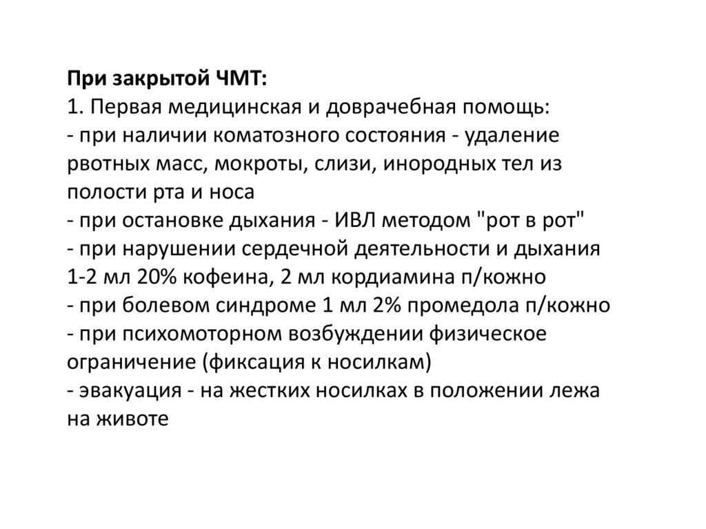 При закрытой ЧМТ:1. Первая медицинская и доврачебная помощь: