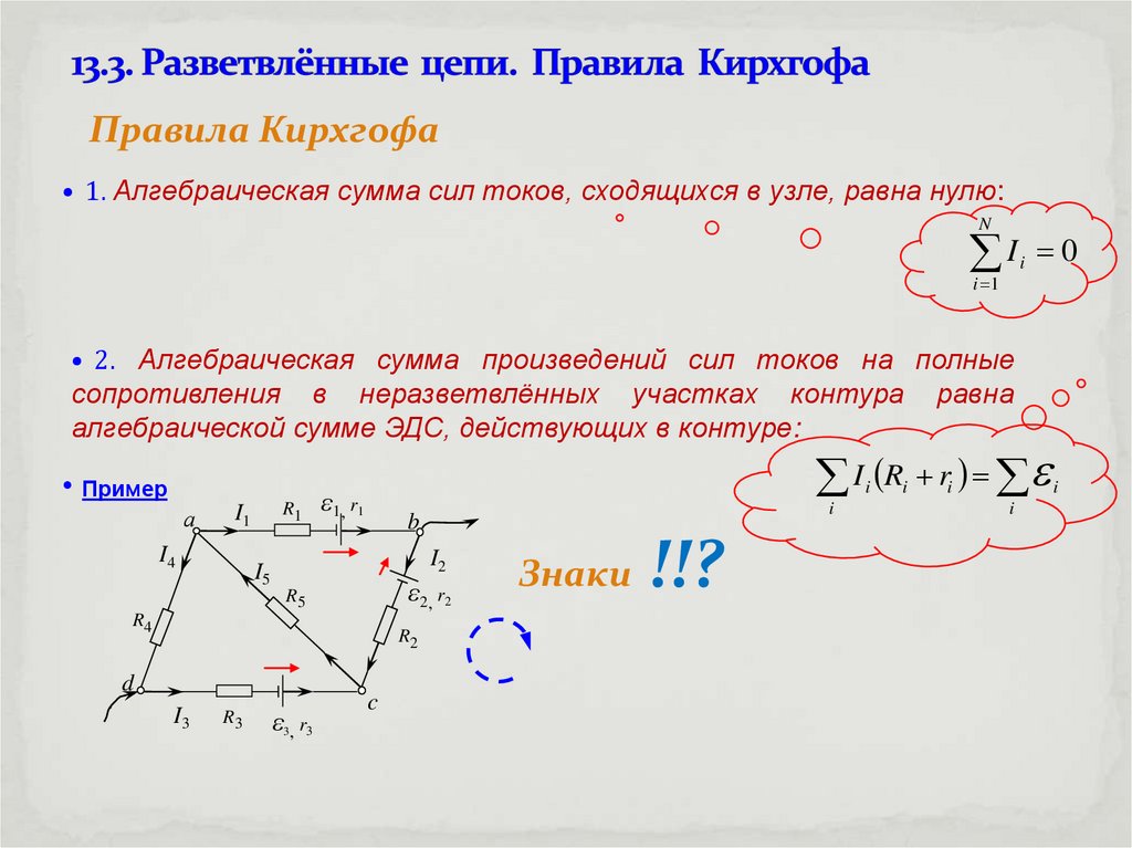 Правила Кирхгофа• 1. Алгебраическая сумма сил токов, сходящихся в узле, равна нулю: