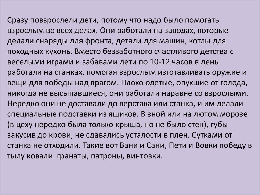 Сразу повзрослели дети, потому что надо было помогатьвзрослым во всех делах. Они работали на заводах, которые