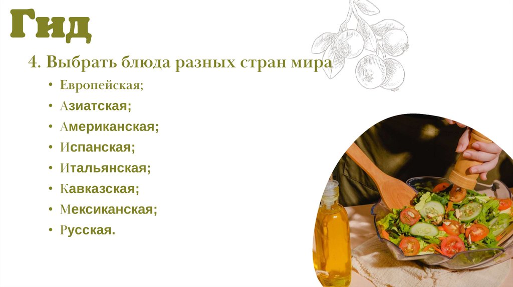 4. Выбрать блюда разных стран мира• Европейская;