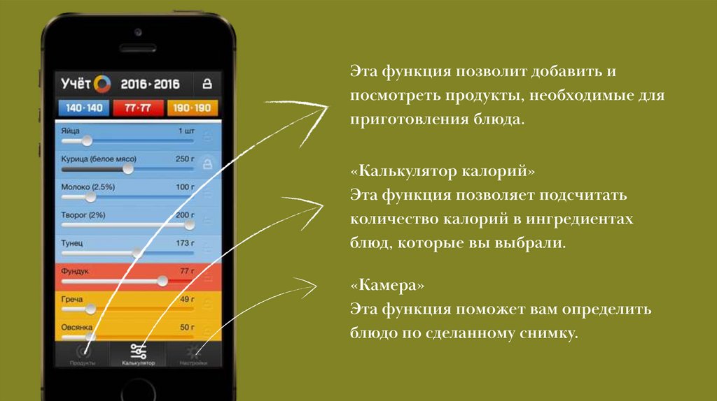 • Расчет сложного уравнения с учетомкалорий, белков, жиров и углеводов