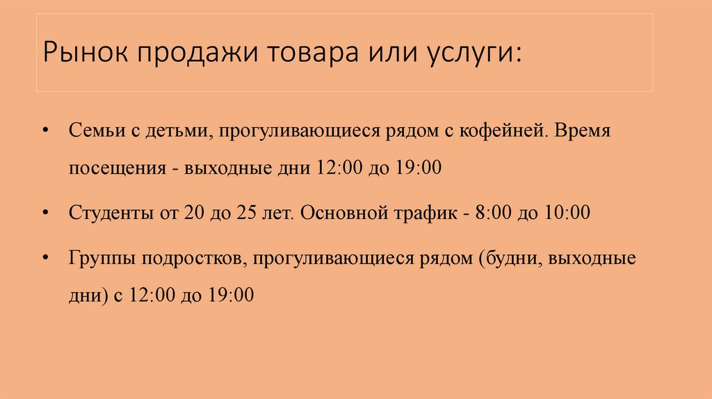 Рынок продажи товара или услуги:• Семьи с детьми, прогуливающиеся рядом с кофейней. Время