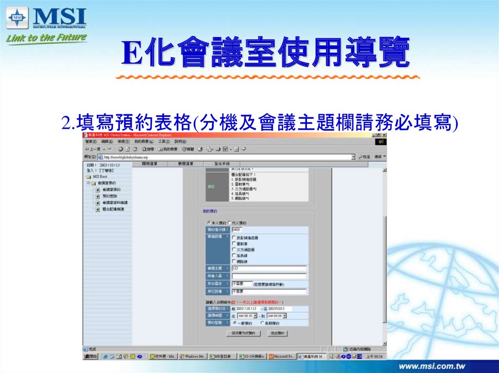 E化會議室使用導覽2.填寫預約表格(分機及會議主題欄請務必填寫)