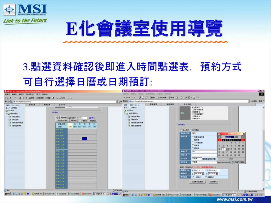 E化會議室使用導覽3.點選資料確認後即進入時間點選表 預約方式