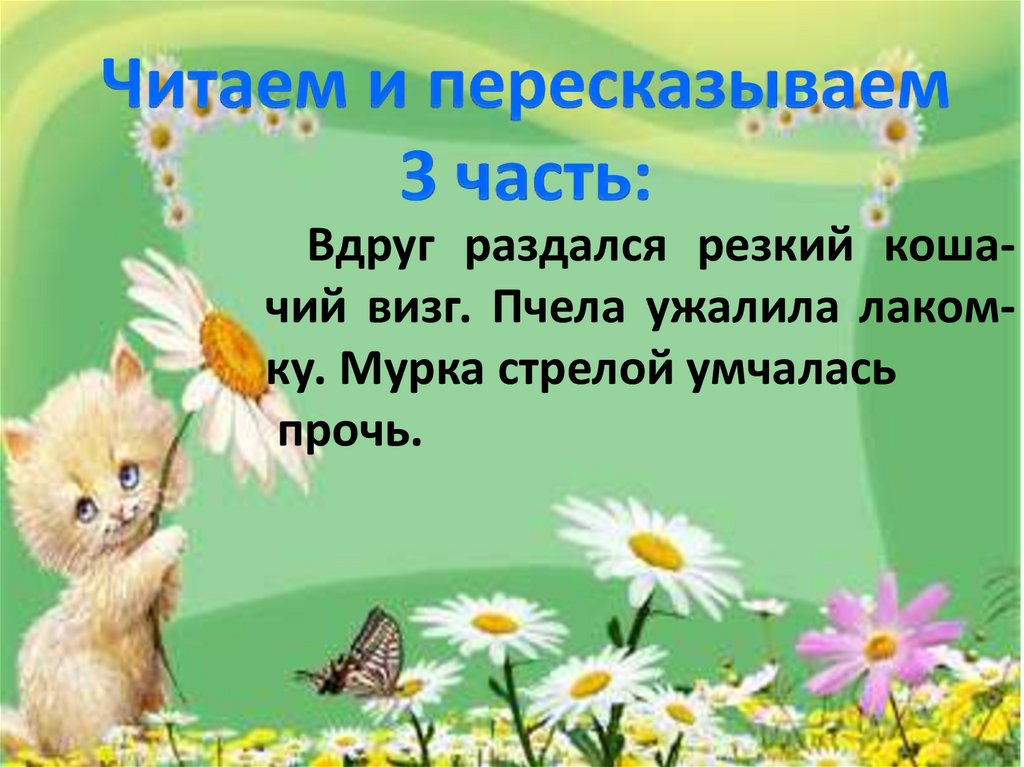 Вдруг раздался резкий кошачий визг. Пчела ужалила лакомку. Мурка стрелой умчаласьпрочь.