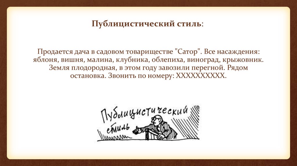 Публицистический стиль:Продается дача в садовом товариществе "Сатор". Все насаждения: