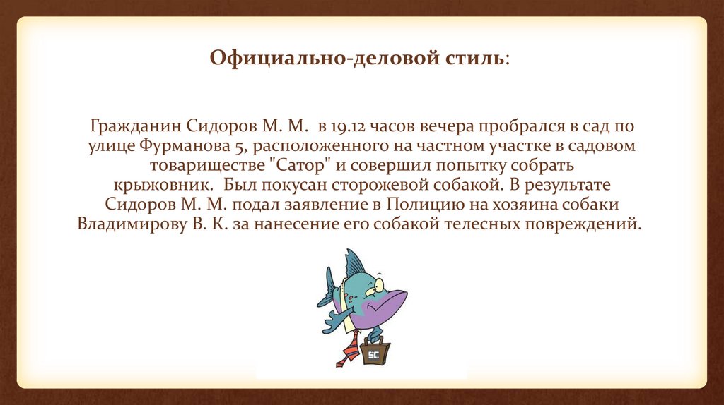Официально-деловой стиль:Гражданин Сидоров М. М. в 19.12 часов вечера пробрался в сад по