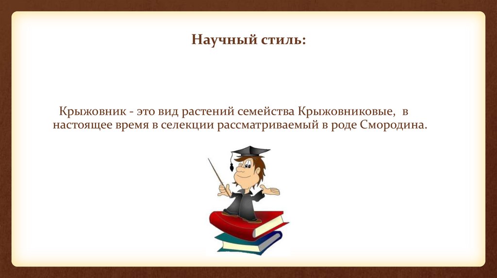 Научный стиль:Крыжовник - это вид растений семейства Крыжовниковые, в