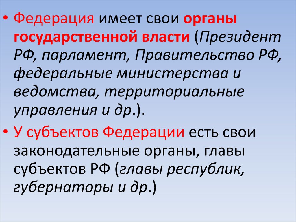 • Федерация имеет свои органыгосударственной власти (Президент
