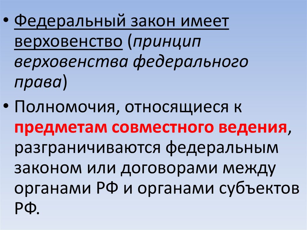 • Федеральный закон имеетверховенство (принцип