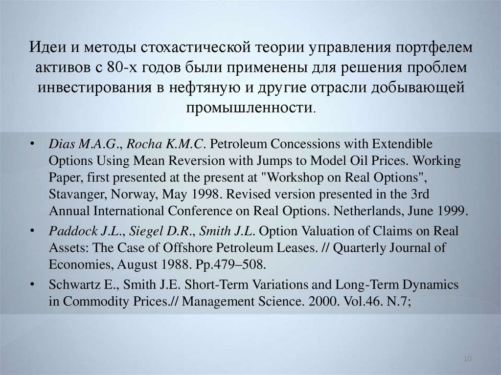 Идеи и методы стохастической теории управления портфелемактивов с 80-х годов были применены для решения проблем