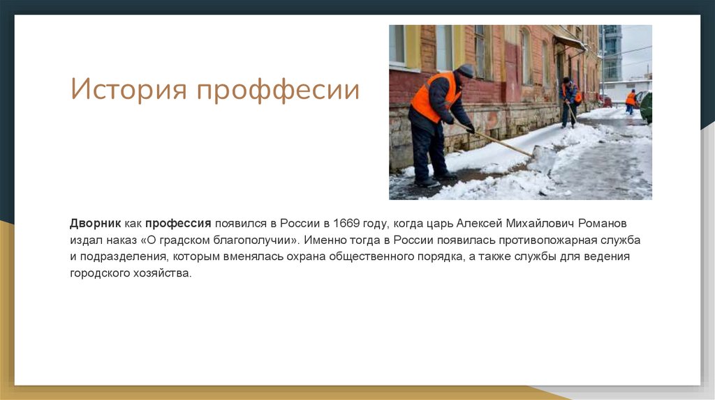 История проффесииДворник как профессия появился в России в 1669 году, когда царь Алексей Михайлович Романов