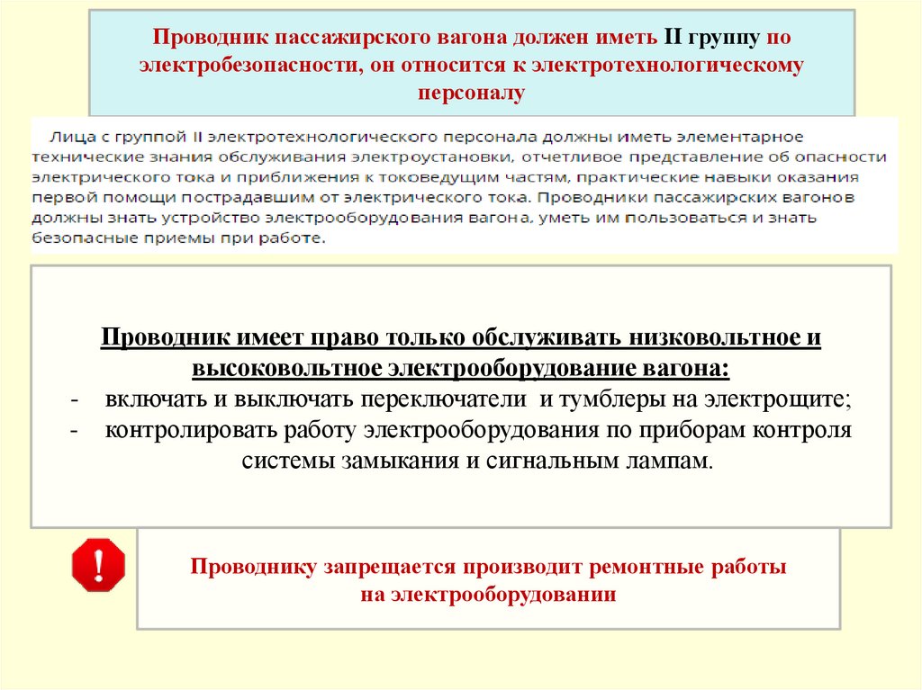 Проводник пассажирского вагона должен иметь II группу поэлектробезопасности, он относится к электротехнологическому
