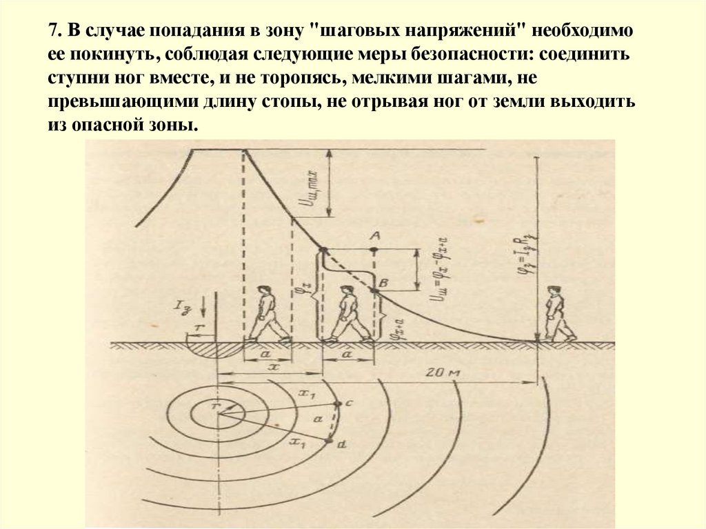 7. В случае попадания в зону "шаговых напряжений" необходимоее покинуть, соблюдая следующие меры безопасности: соединить