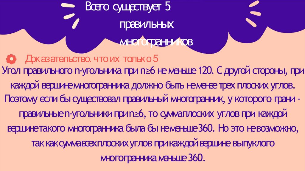 Поэтому если бы существовал правильный многогранник, у которого грани правильныеn-угольникиприn≥6, то суммаплоских углов при каждой