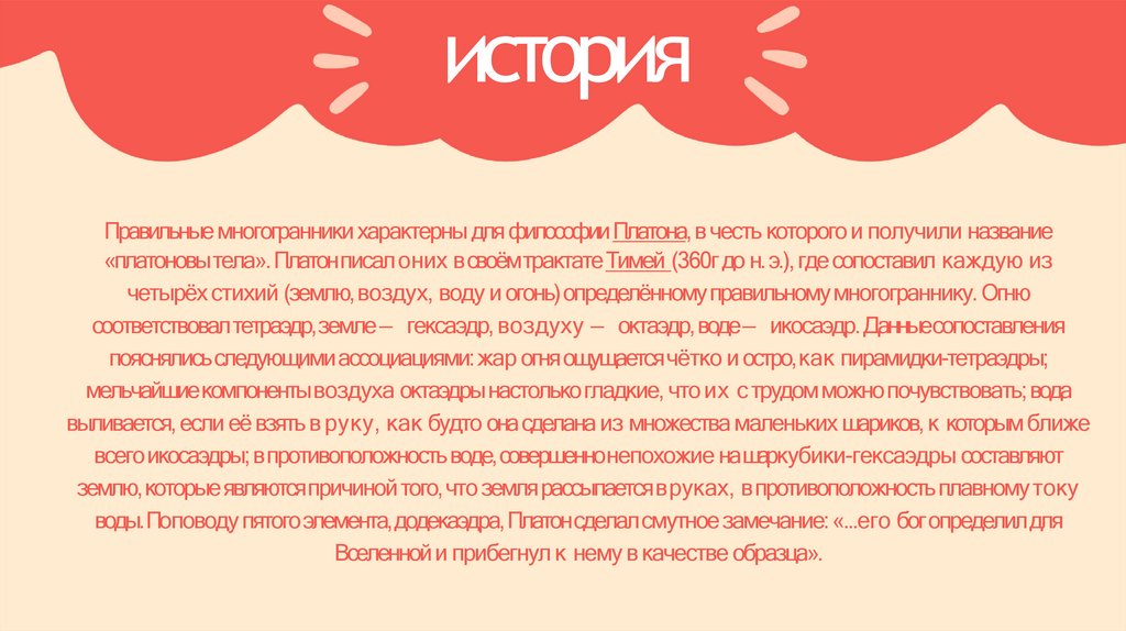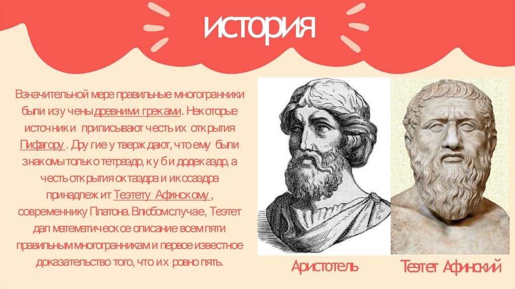 историяПравильные многогранники характерны для философииПлатона, в честь которого и получили название