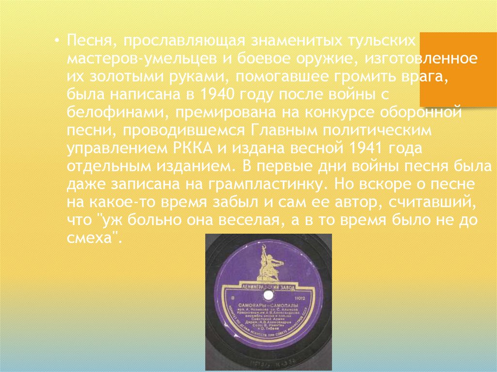 • Песня, прославляющая знаменитых тульскихмастеров-умельцев и боевое оружие, изготовленное