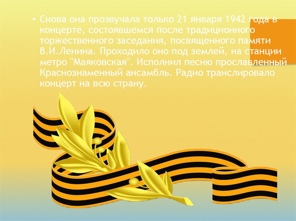 • Снова она прозвучала только 21 января 1942 года вконцерте, состоявшемся после традиционного