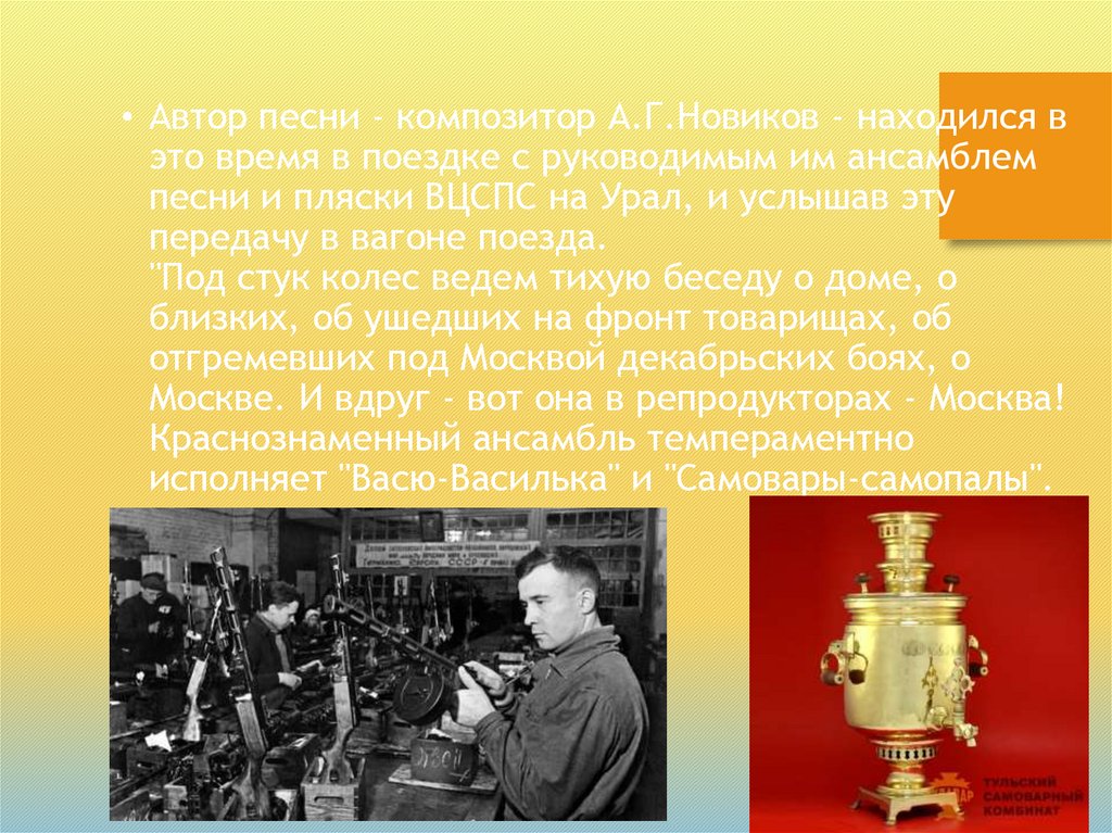 • Автор песни - композитор А.Г.Новиков - находился вэто время в поездке с руководимым им ансамблем
