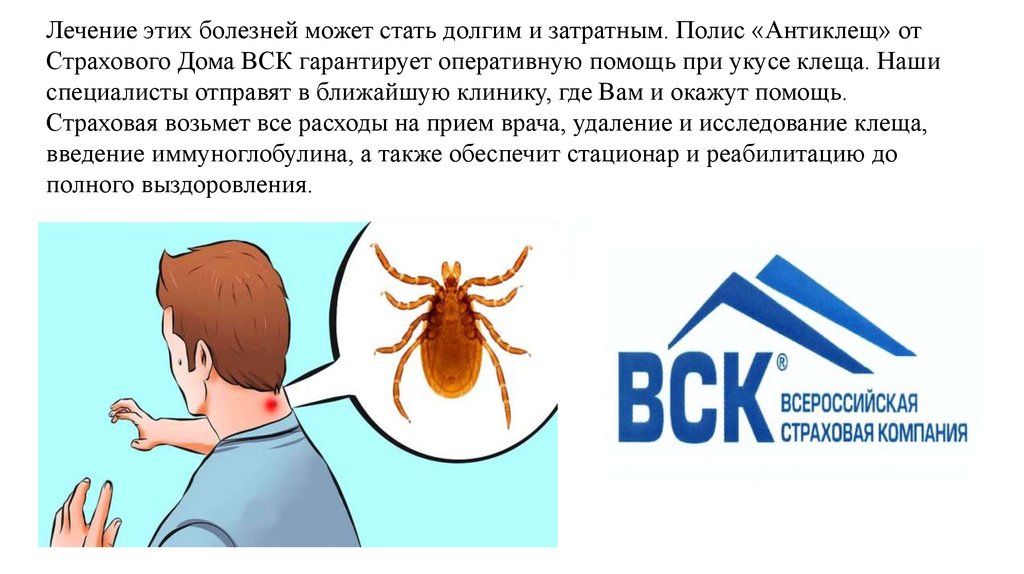 Лечение этих болезней может стать долгим и затратным. Полис «Антиклещ» отСтрахового Дома ВСК гарантирует оперативную помощь при укусе клеща. Наши