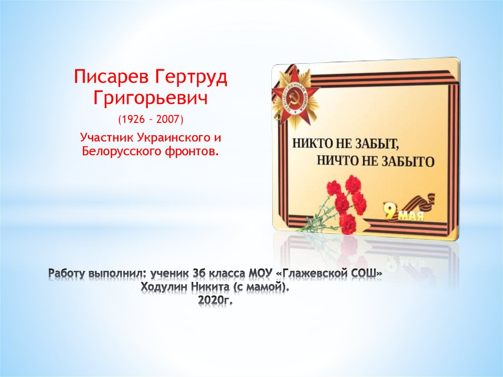 1. Работу выполнил: ученик 3б класса МОУ «Глажевской СОШ» Ходулин Никита (с мамой). 2020г.