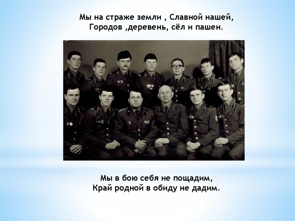 Мы на страже земли , Славной нашей,Городов ,деревень, сёл и пашен.