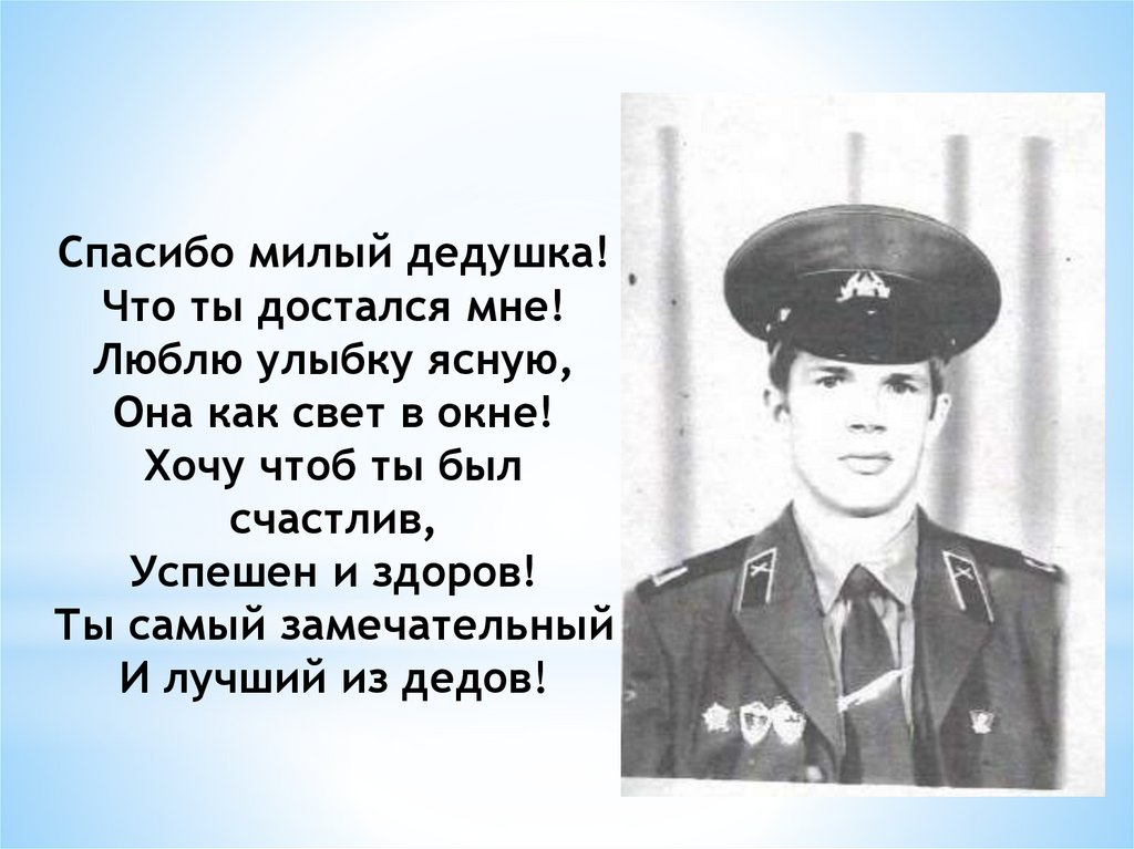 3. Деда поздравляю С праздником мужским! В юности, я знаю , В армии служил. Значит тоже воин, Хоть не командир Праздника достоин,