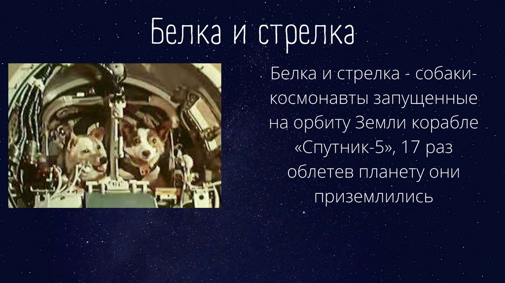 Белка и стрелка - собакикосмонавты запущенныена орбиту Земли корабле