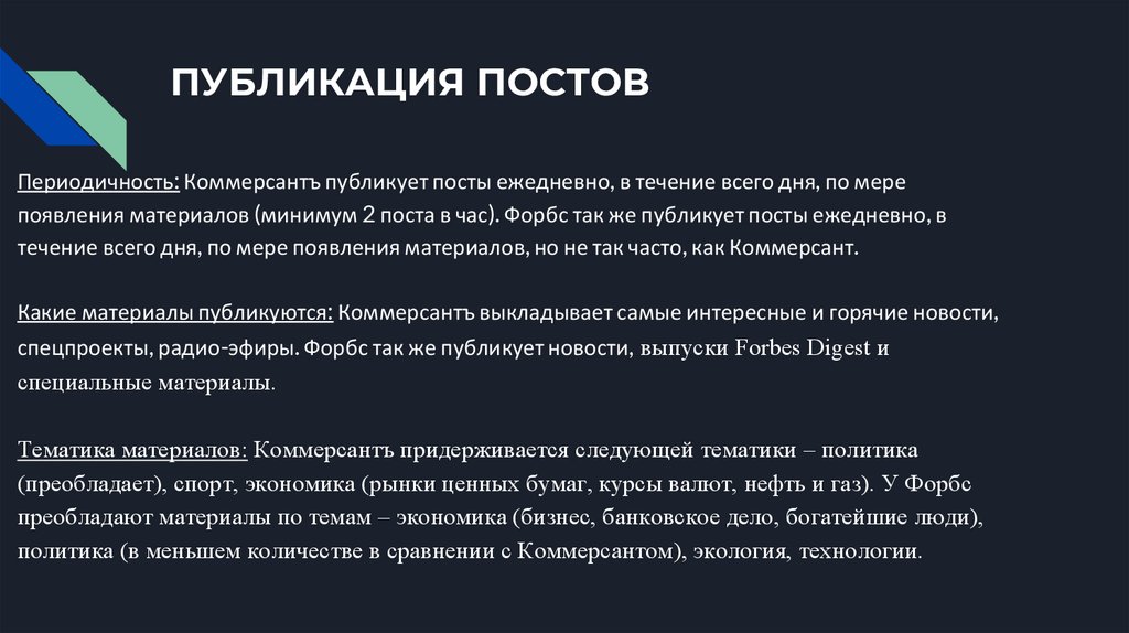 появления материалов (минимум 2 поста в час). Форбс так же публикует посты ежедневно, в