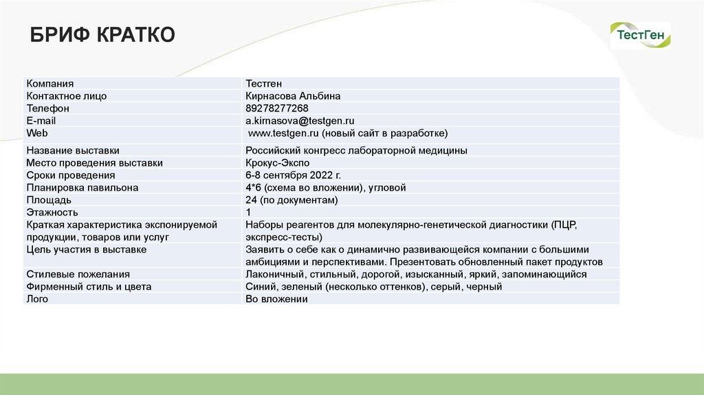 Бриф на разработку концепции дизайна и застройку стенда компании на «Российском конгрессе лабораторной медицины»
