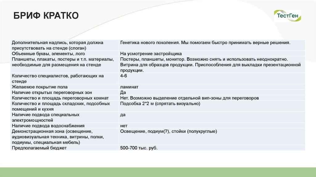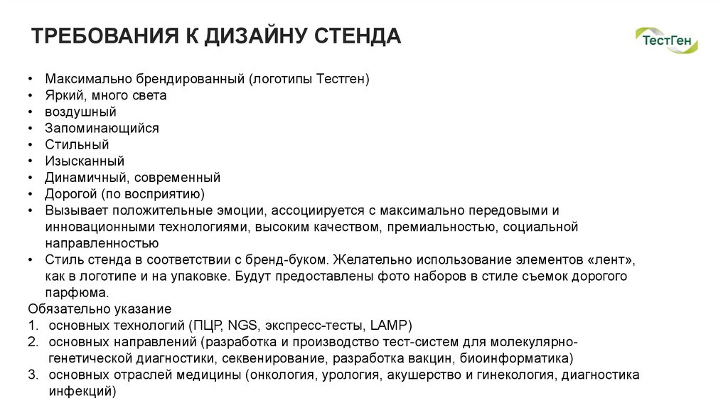 ТРЕБОВАНИЯ К ДИЗАЙНУ СТЕНДАМаксимально брендированный (логотипы Тестген)