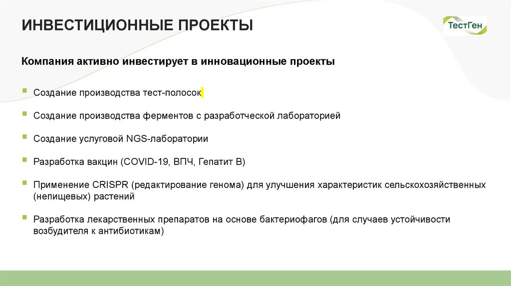 ИНВЕСТИЦИОННЫЕ ПРОЕКТЫКомпания активно инвестирует в инновационные проекты