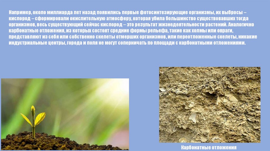 Например, около миллиарда лет назад появились первые фотосинтезирующие организмы, их выбросы –кислород – сформировали окислительную атмосферу, которая убила большинство существовавших тогда