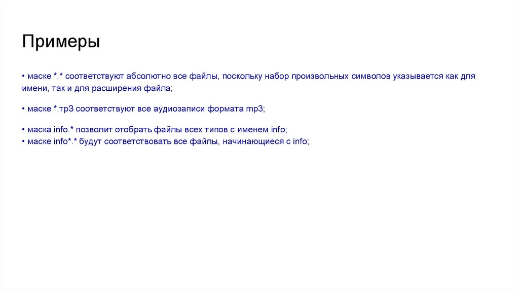 Примеры• маске *.* соответствуют абсолютно все файлы, поскольку набор произвольных символов указывается как для