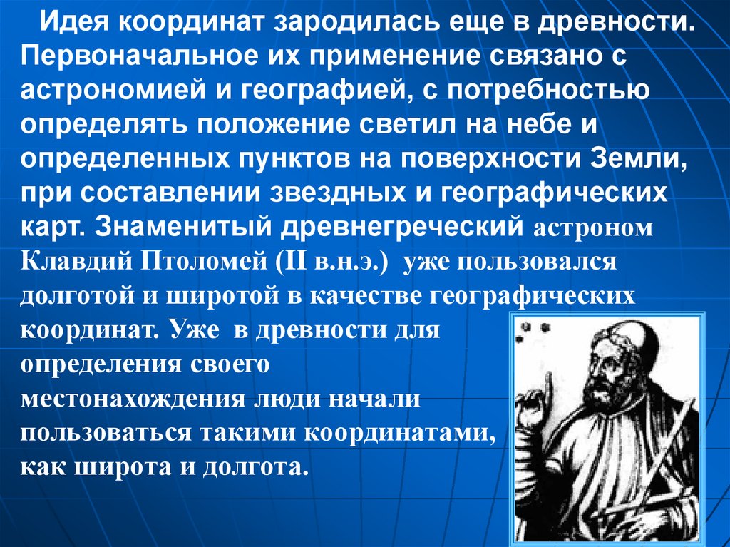 Идея координат зародилась еще в древности.Первоначальное их применение связано с