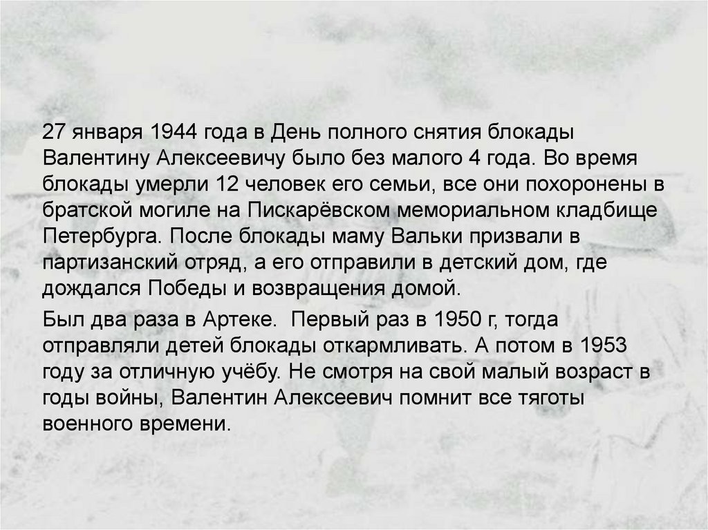 27 января 1944 года в День полного снятия блокадыВалентину Алексеевичу было без малого 4 года. Во время
