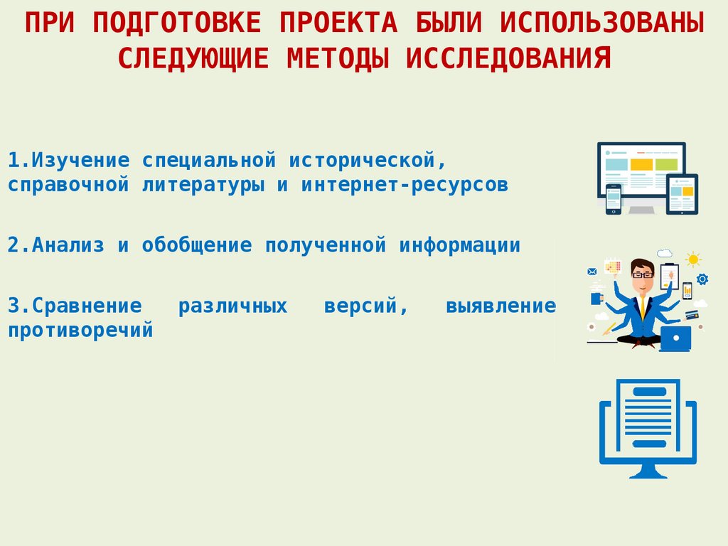ПРИ ПОДГОТОВКЕ ПРОЕКТА БЫЛИ ИСПОЛЬЗОВАНЫСЛЕДУЮЩИЕ МЕТОДЫ ИССЛЕДОВАНИЯ