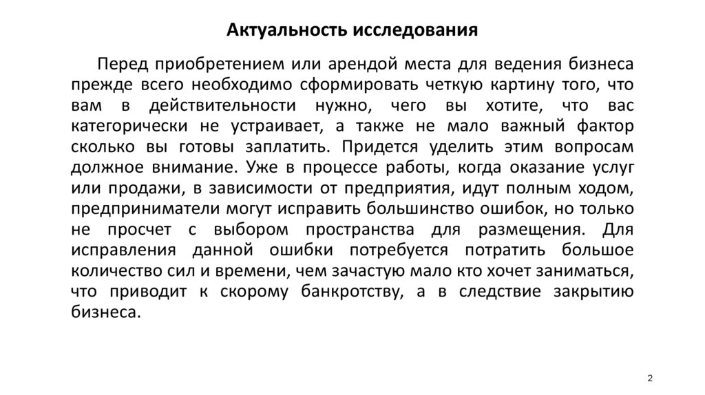 Актуальность исследованияПеред приобретением или арендой места для ведения бизнеса