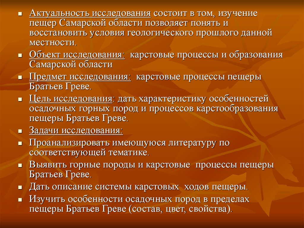 Актуальность исследования состоит в том, изучениепещер Самарской области позволяет понять и