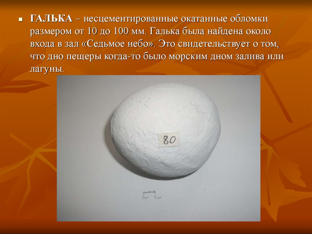 ГАЛЬКА – несцементированные окатанные обломкиразмером от 10 до 100 мм. Галька была найдена около