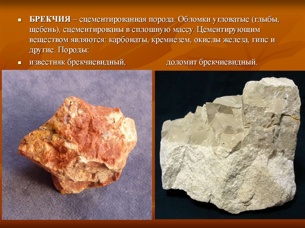 БРЕКЧИЯ – сцементированная порода. Обломки угловатые (глыбы,щебень), сцементированы в сплошную массу. Цементирующим