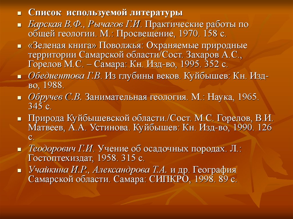 Список используемой литературыБарская В.Ф., Рычагов Г.И. Практические работы по