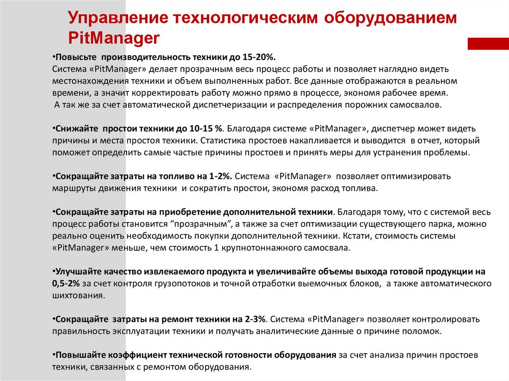 •Сокращайте затраты на ремонт техники на 2-3%. Система «PitManager» позволяет контролировать