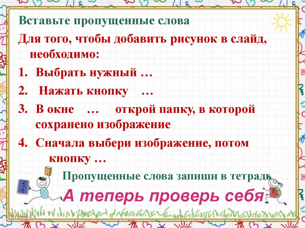 Вставьте пропущенные словаДля того, чтобы добавить рисунок в слайд,